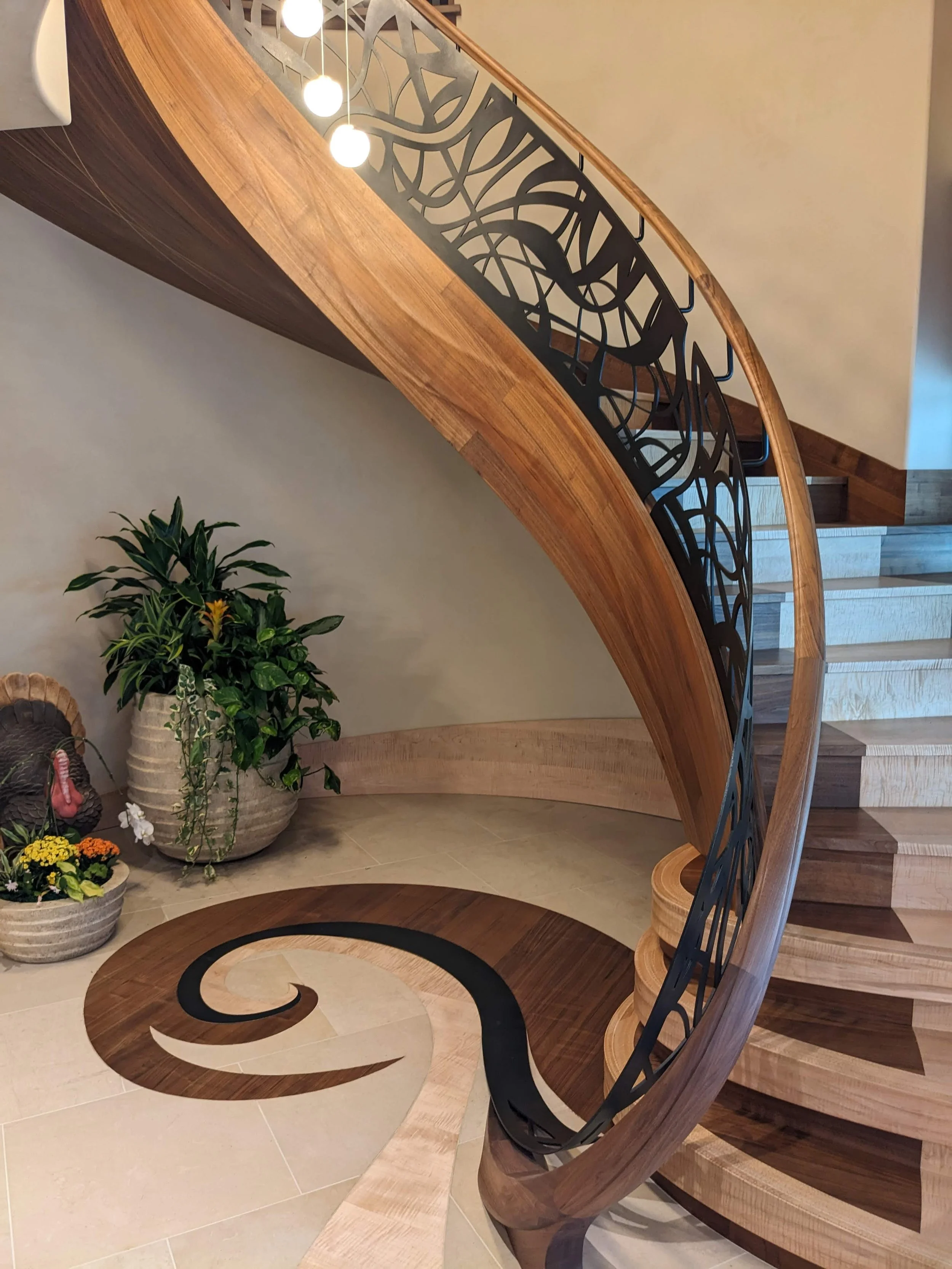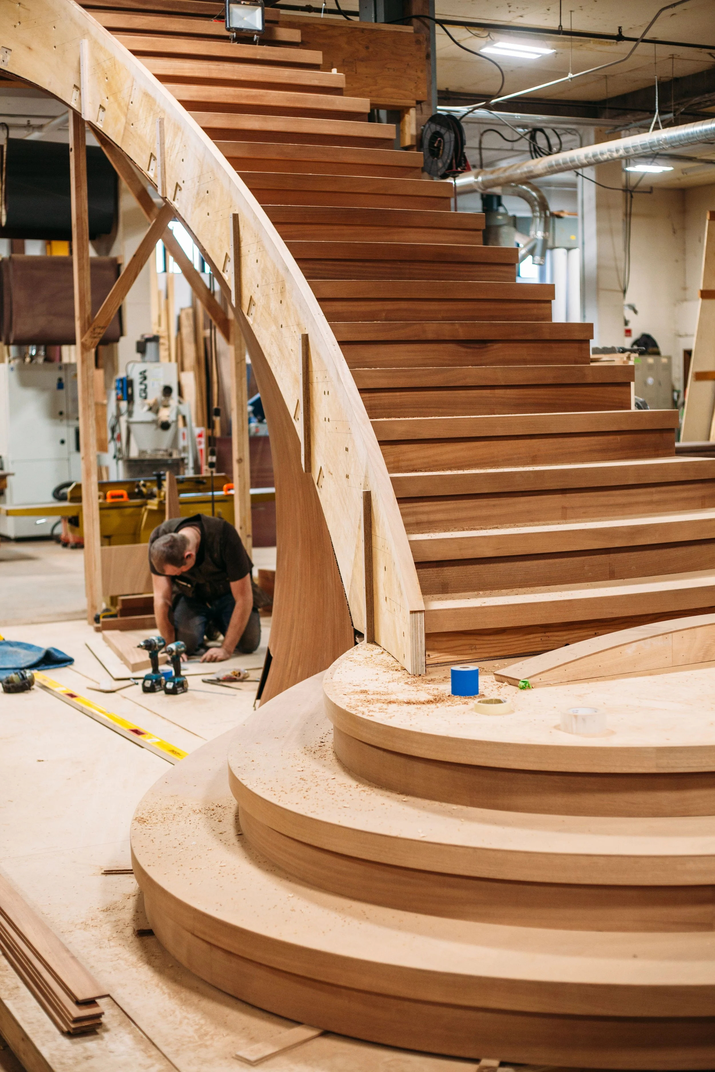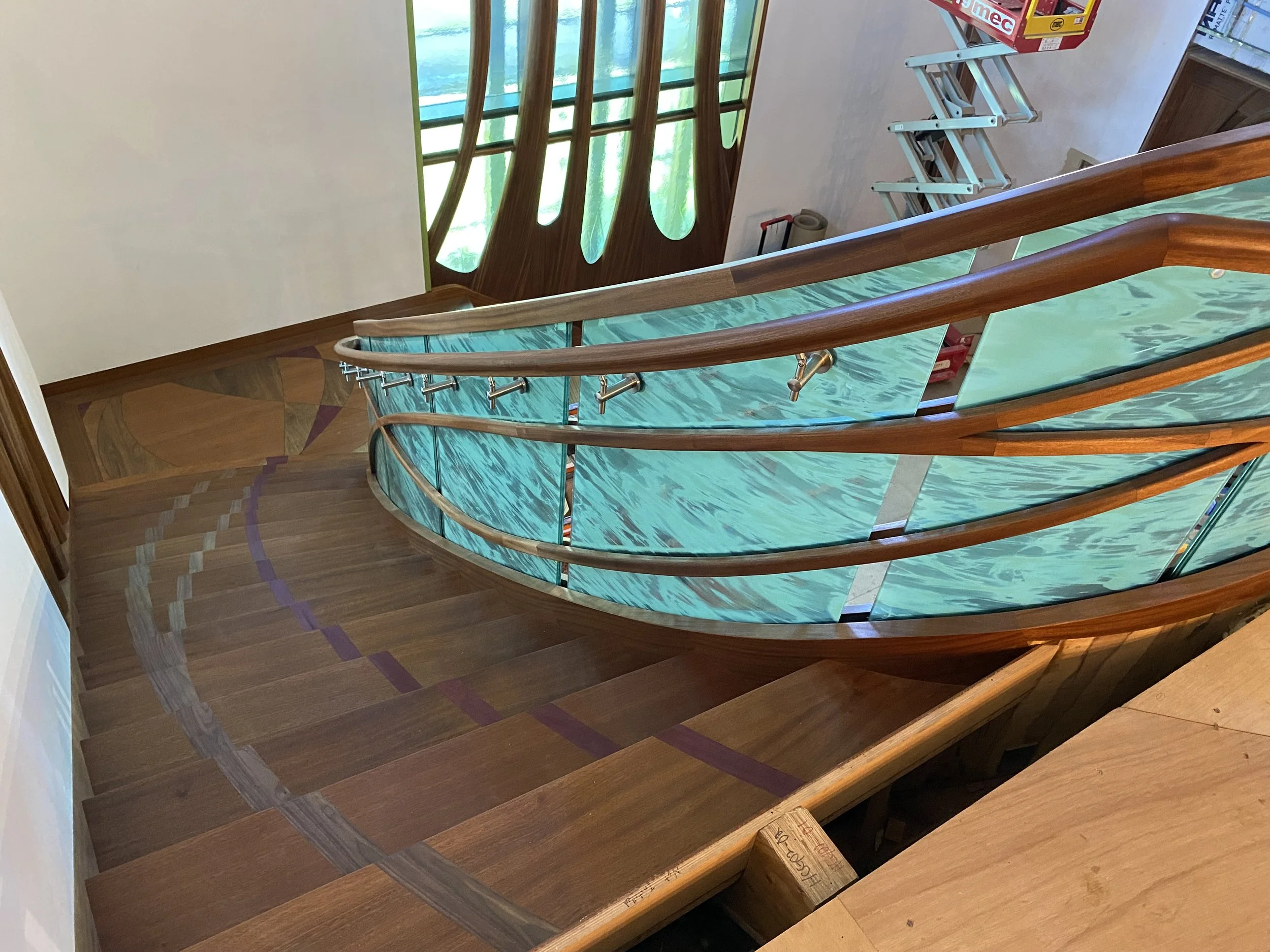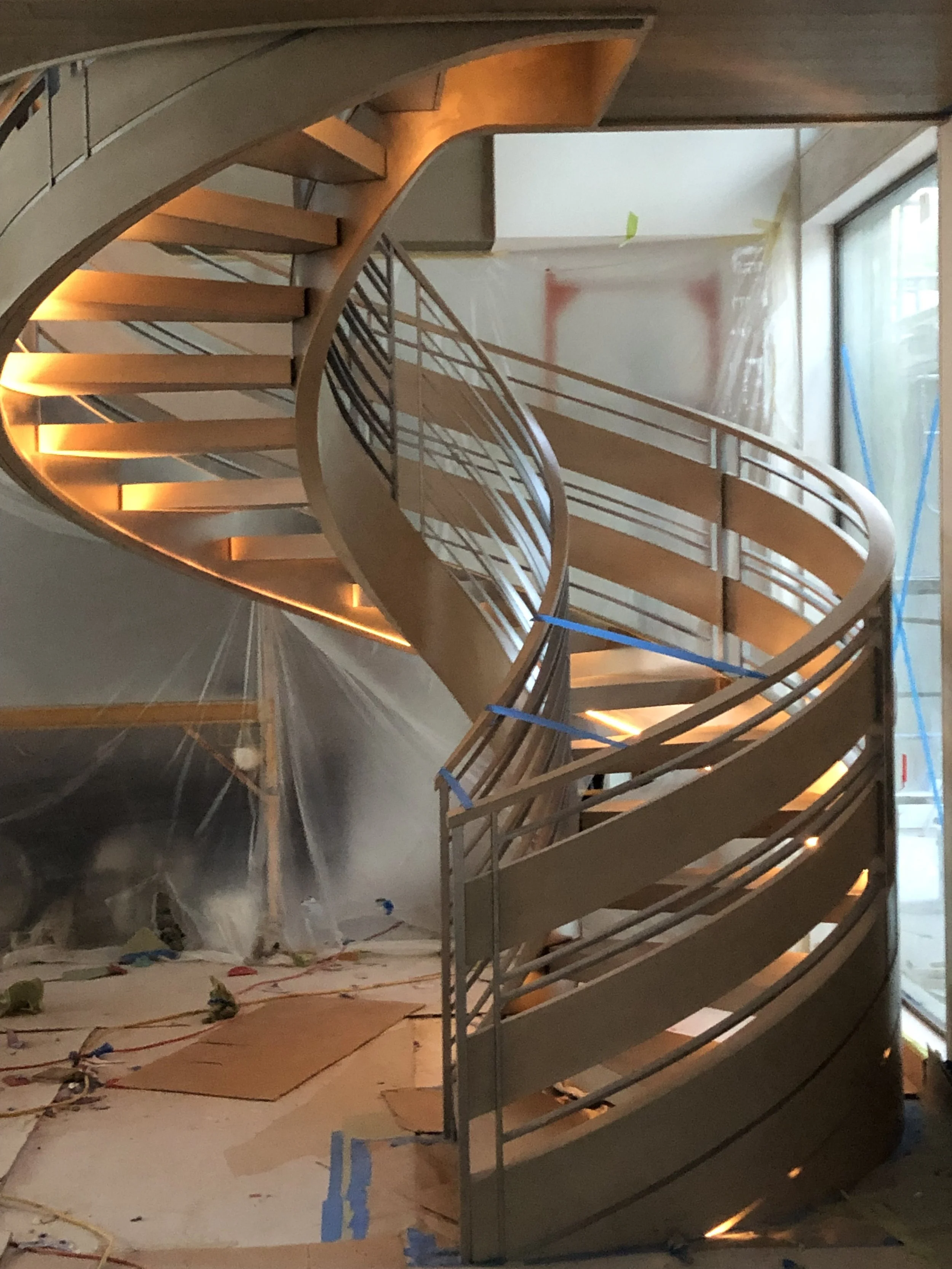 making large floating curved and elliptical stairs, circular staircases made of many different materials, hardwoods, bronze, glass, & steel.