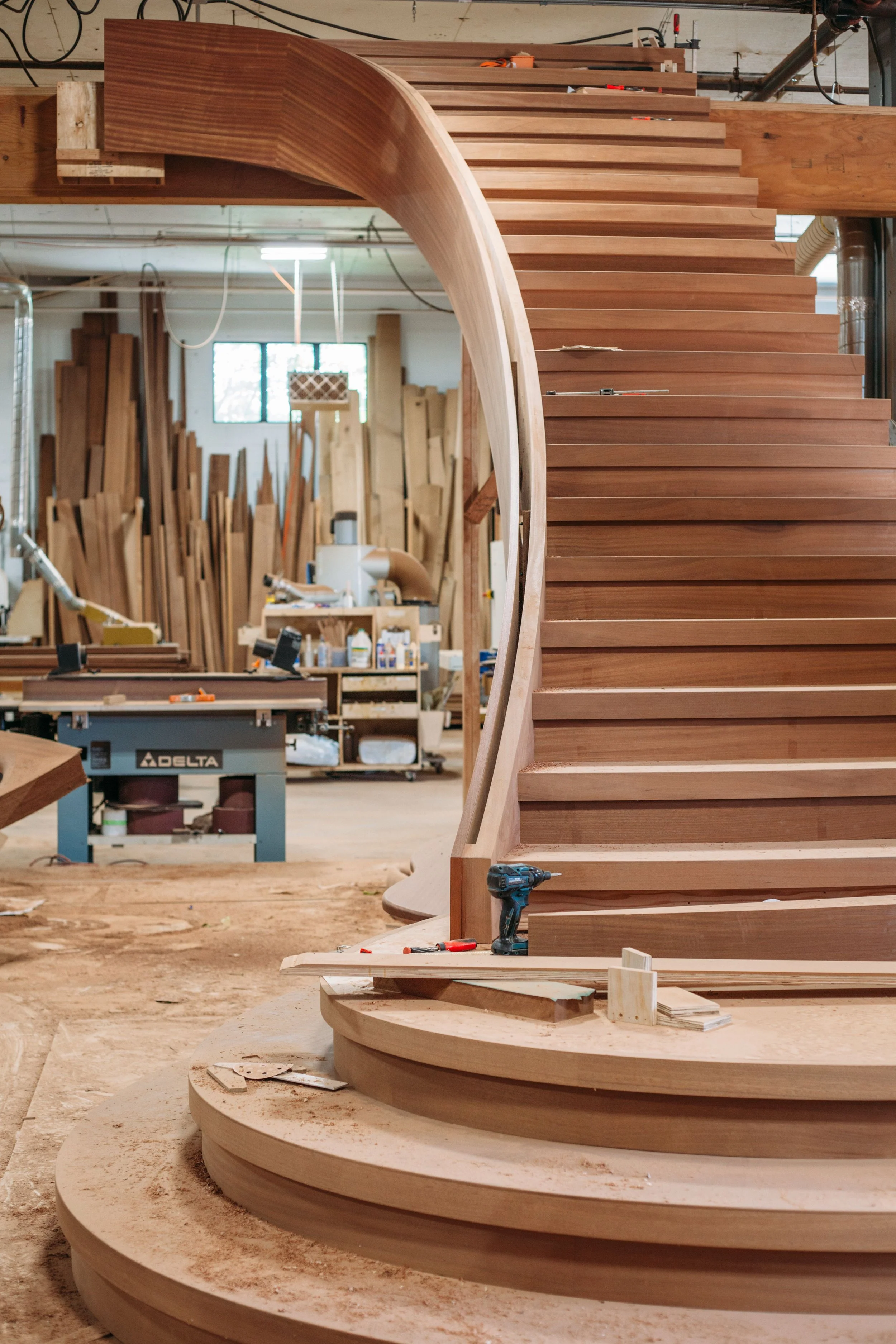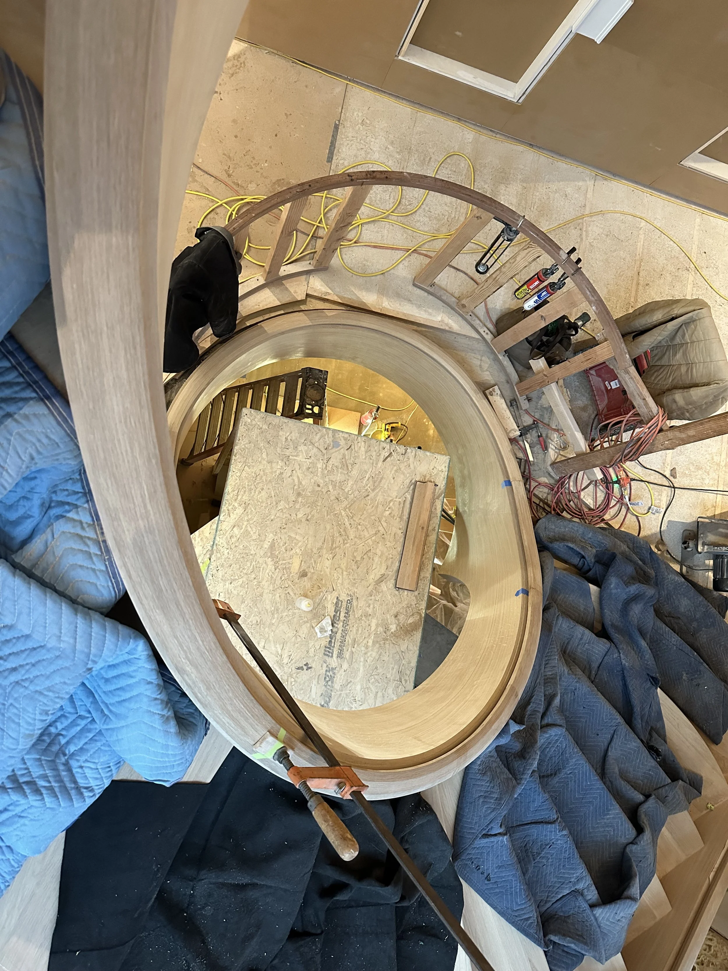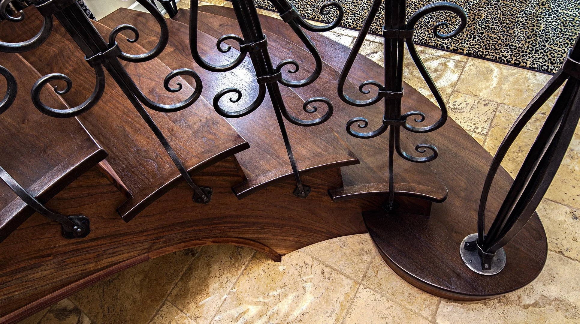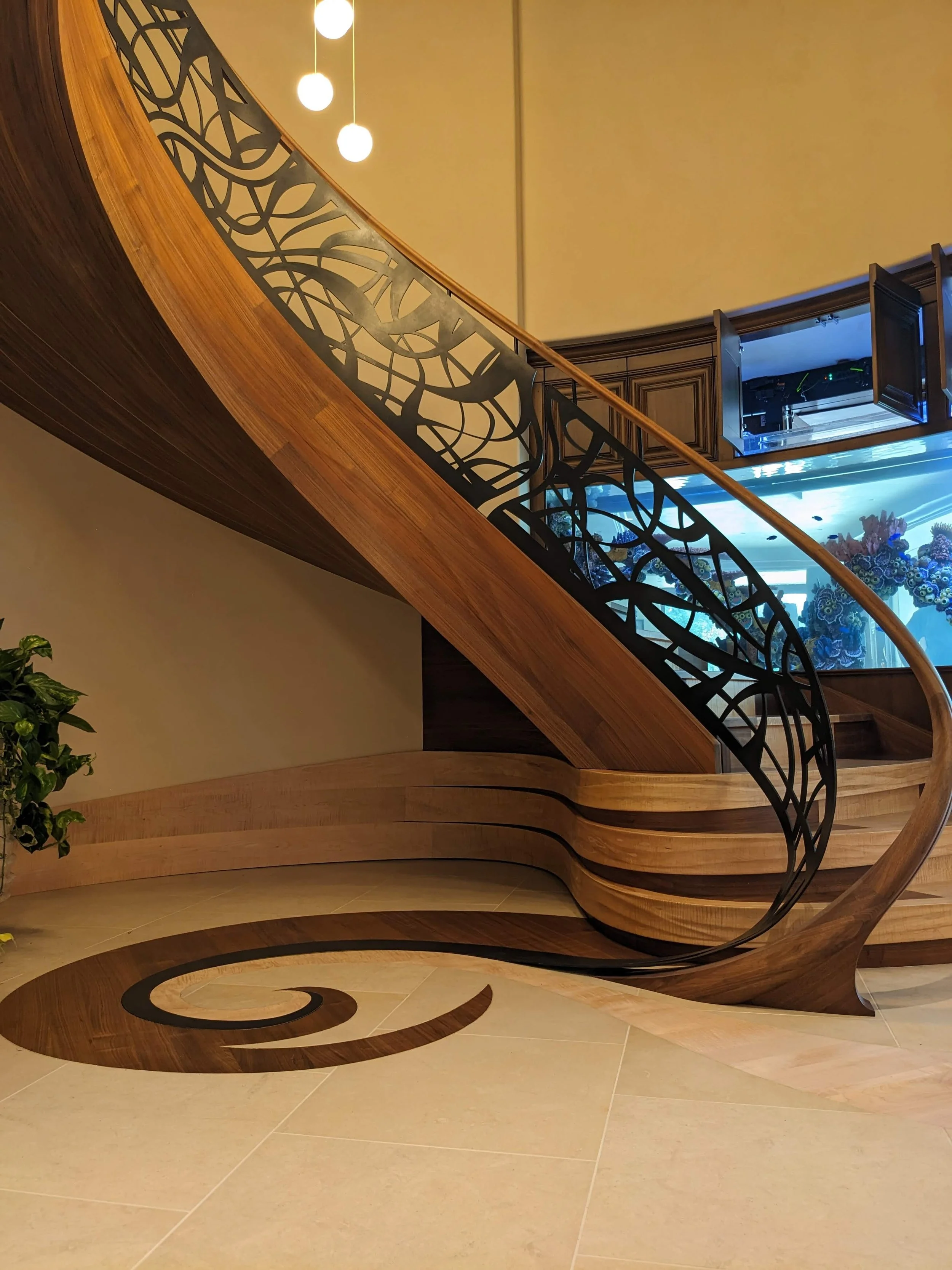 making large floating curved and elliptical stairs, circular staircases made of many different materials, hardwoods, bronze, glass, & steel.